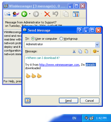 Посмотреть скриншот WinMessengerWinMessenger эта простая, элегантная и очень удобная программа, полностью совместимая со стандартным WinPopup/net send, обладающая очень схожим интерфейсом, но лишенная всех недостатков WinPopup, таких как несовместимость с Windows NT4/2000/XP и работу на панели задач. WinMessenger совместим абсолютно со всеми версиями Windows (от оригинального Windows 95 до последнего Windows XP) и использует максимум возможностей каждой операционной системы, а кроме того поддерживает графические «смайлики», ссылки, выбор адресата из списка и работает в системной области уведомления – «трэе».